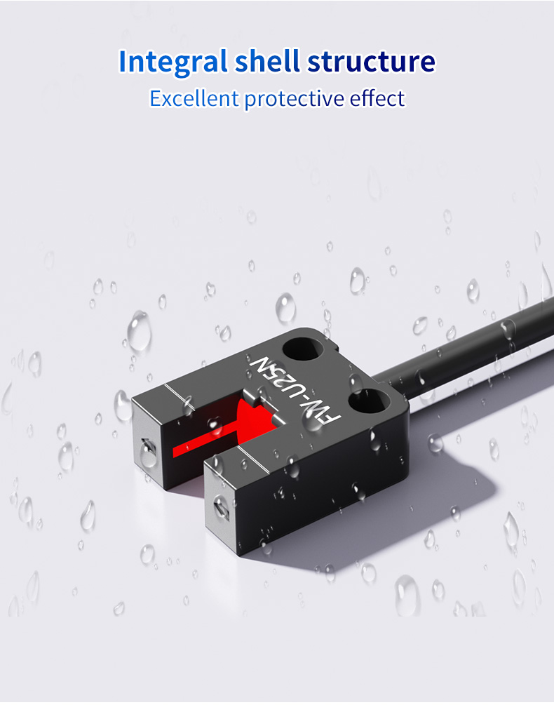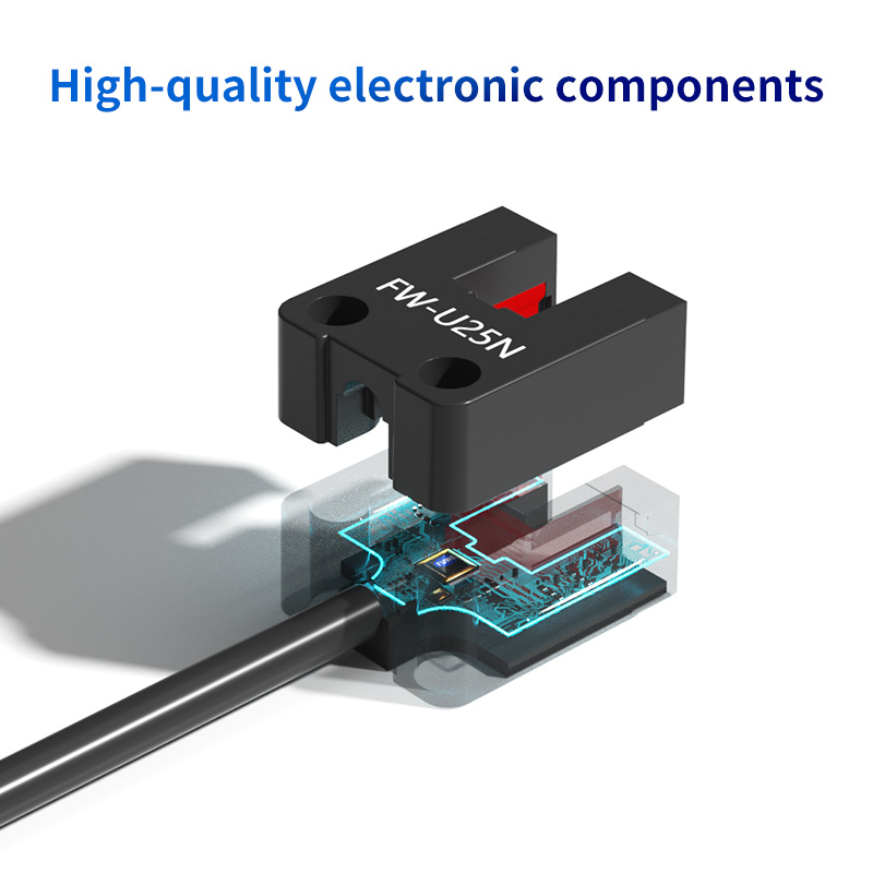 O núcleo da série FW25 é sua largura de ranhura de 5 mm projetada com precisão. Este design compacto, mas eficaz, permite a detecção de objetos muito pequenos, sinalizadores finos ou abas de atuador que passam pela ranhura. O princípio de detecção de feixe direto dentro da ranhura garante alta imunidade à luz ambiente e à refletividade da superfície, fornecendo um sinal estável e confiável mesmo em condições desafiadoras. Isso o torna perfeito para aplicações que exigem precisão posicional exata, como detecção de origem em guias lineares ou contagem de dentes em uma engrenagem pequena.