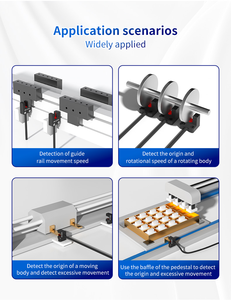 A versatilidade do sensor de ranhura em U FW25 o torna um componente indispensável em vários setores, incluindo embalagem, manuseio de materiais, usinagem CNC e automação de montagem. Detecção da velocidade de movimento do trilho-guia: Em sistemas de movimento linear, uma bandeira montada em um carro em movimento pode passar pela ranhura em U. Contando os pulsos ao longo do tempo, o FW25 pode calcular com precisão a velocidade linear do trilho-guia, permitindo o monitoramento e o controle da velocidade. Detecte a origem e o deslocamento excessivo de um corpo em movimento: O sensor é perfeitamente adequado para sequências de retorno. Uma aba em um atuador linear ou braço robótico passa pela ranhura, fornecendo um sinal preciso de "inicial" ou "origem" ao controlador. Além disso, um segundo sensor pode ser colocado no final do percurso para detectar o excesso de percurso, evitando danos mecânicos e garantindo a segurança operacional. Detecte a origem e a velocidade de rotação de um corpo giratório: monte uma única aba ou uma roda multidentada em um eixo giratório. À medida que cada aba passa pela ranhura de 5 mm, o FW25 gera um pulso. Um único pulso por rotação fornece dados de origem, enquanto vários pulsos permitem o cálculo preciso da velocidade de rotação (RPM), essencial para controle do motor e monitoramento de processos. Uso com defletores de suporte de montagem para posicionamento: Muitos sistemas usam defletores fixos simples. O FW25 pode ser combinado com seu suporte de montagem ou acessórios personalizados para detectar a presença ou posição desses defletores, criando um sistema de comutação de limite simples e econômico.
