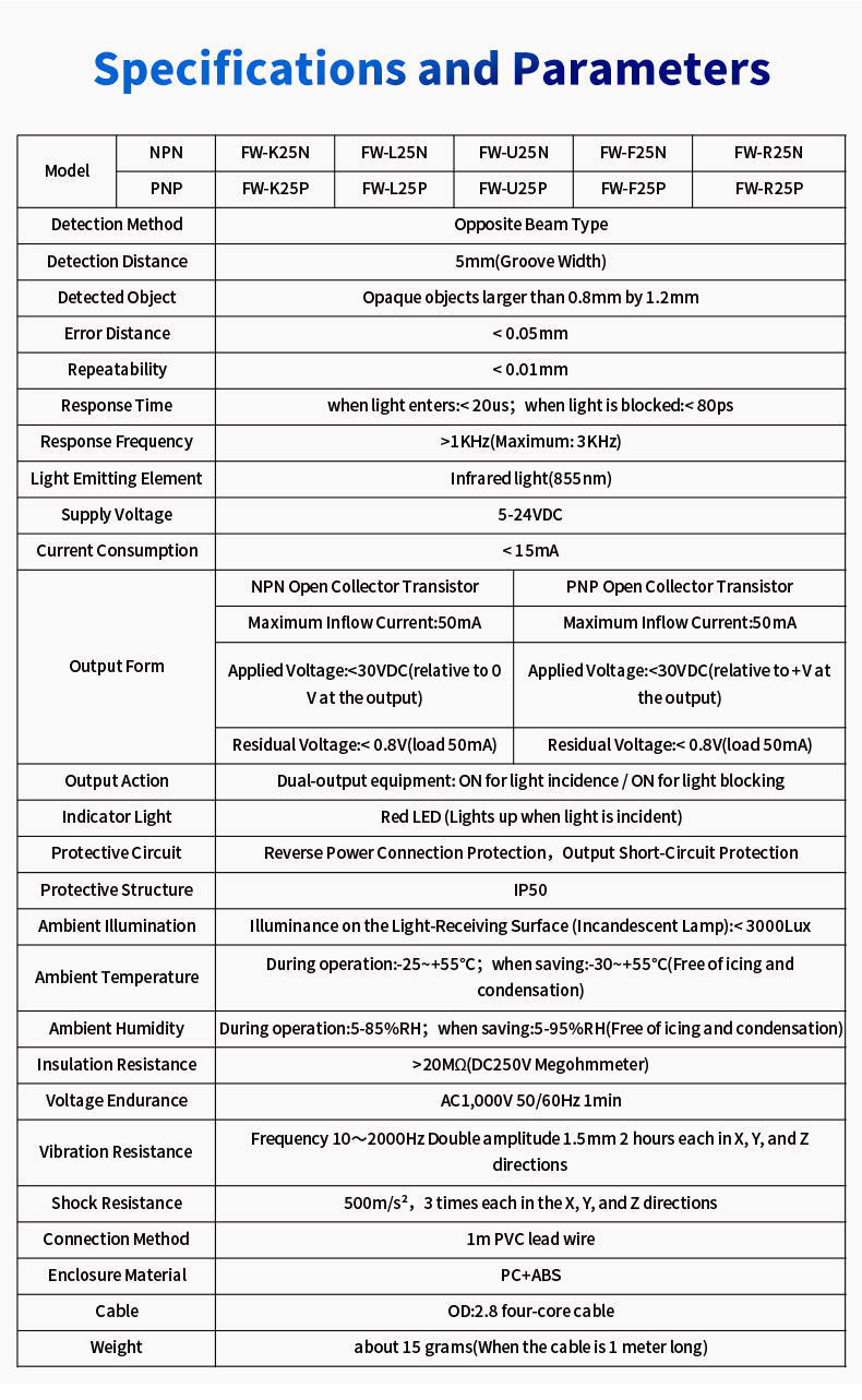 No exigente mundo da automação industrial, a confiabilidade e a precisão não são apenas recursos – são necessidades. O sensor fotoelétrico com ranhura em U da série FW25 foi projetado para atender a essas demandas críticas, oferecendo precisão e durabilidade incomparáveis para uma ampla gama de aplicações de detecção. Com uma largura de detecção de ranhura em U padronizada de 5 mm, este sensor é a solução ideal para engenheiros e integradores de sistemas que exigem desempenho consistente na detecção de pequenos componentes, posicionamento preciso e controle de movimento.