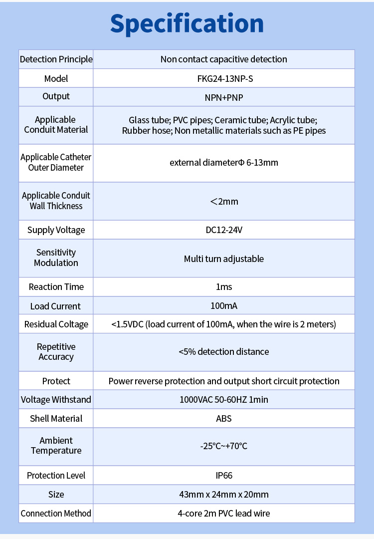 FKG24-13NP-S Baixo nível de detecção do capacitor Tubo Tubo Características de desempenho do sensor: