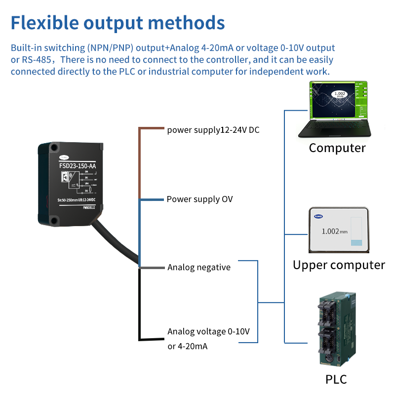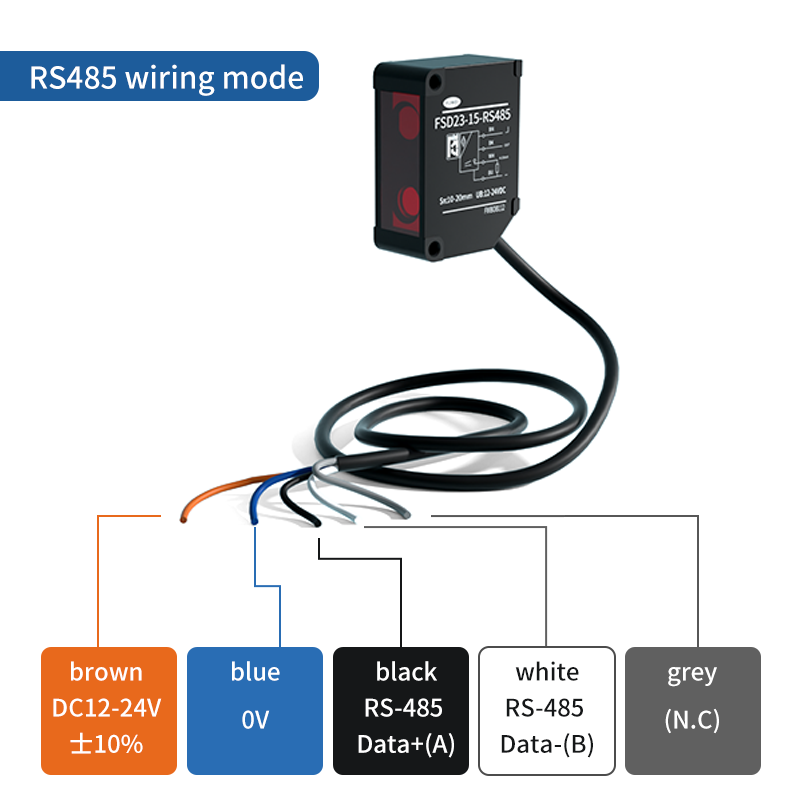 1. Saída RS-485: Este método de saída de interface suporta a transmissão de dados de longa distância e possui forte capacidade anti-interferência. Através da interface RS-485, os sensores da série FSD23 podem funcionar de forma independente sem se conectar a controladores adicionais, sejam os PLCs (controladores lógicos programáveis) ou controladores industriais, o que simplifica muito o processo de integração do sistema e reduz o custo do equipamento e a dificuldade de manutenção para empresas.