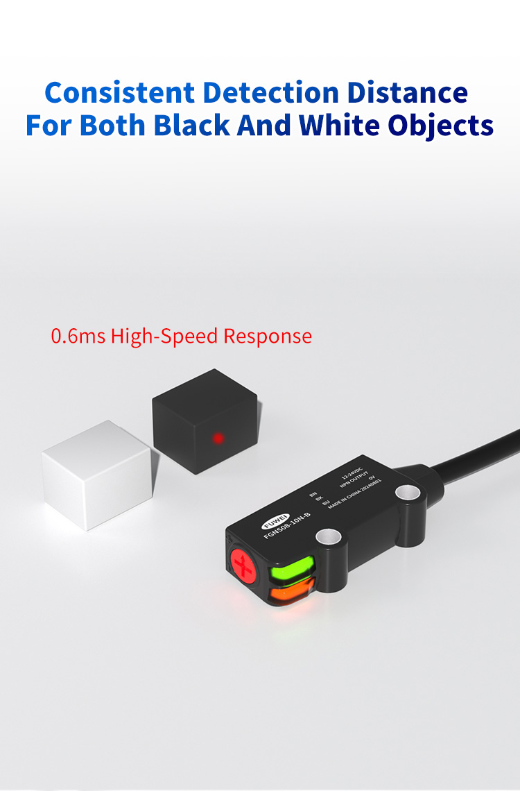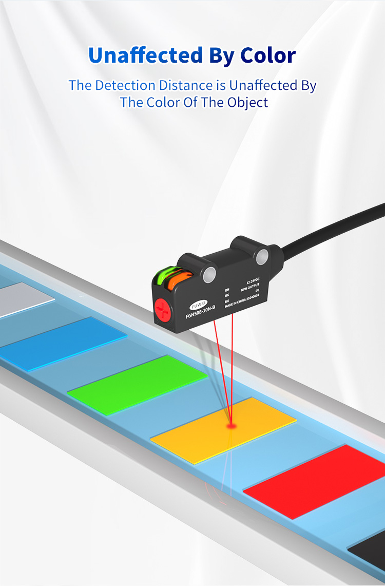 Os sensores fotoelétricos tradicionais geralmente requerem parâmetros de detecção de reajuste ao encontrar objetos de cores diferentes, impactando severamente a eficiência da produção. A série FGNS08-10 emprega a tecnologia avançada de supressão de fundo, garantindo que a distância de detecção permaneça completamente não afetada pela cor do objeto. Com uma faixa de detecção máxima ajustável de 10 cm, o sensor mantém um desempenho consistente, independentemente dos objetos escuros, claros ou coloridos. Isso aumenta significativamente a adaptabilidade e a estabilidade da linha de produção.
