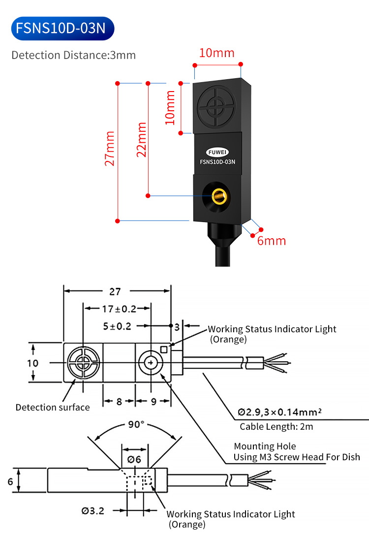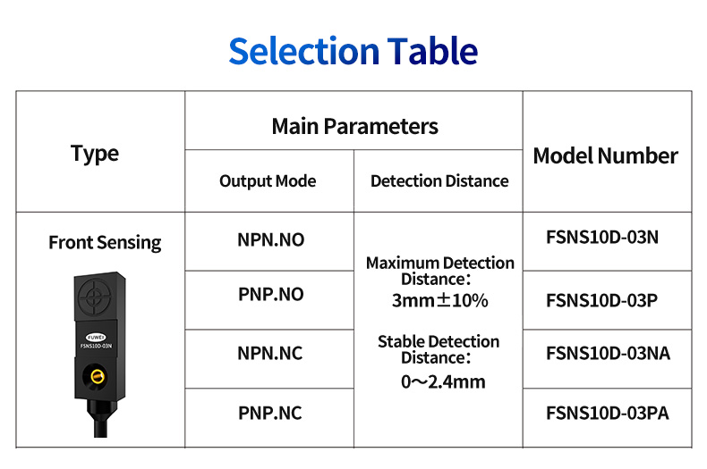 Antes de mergulhar nas especificações técnicas, vamos esclarecer o valor fundamental que o FSNS10D-03N traz ao seu sistema: Obtenha detecção de "zero defeito" com estabilidade incomparável: projetado com capacidades de detecção estáveis e forte capacidade anti-interferência, este sensor ignora de forma confiável a desordem metálica e o ruído elétrico ao redor. Isso se traduz diretamente na redução do tempo de inatividade, maior qualidade do produto e menores custos de manutenção. Desbloqueie velocidades mais altas com capacidade de resposta inteligente: O chip inteligente integrado garante uma velocidade de resposta excepcionalmente rápida, permitindo detecção precisa em processos automatizados de alta velocidade. Isso permite aumentar os tempos de ciclo e maximizar o rendimento sem sacrificar a precisão. Conquiste o espaço e os desafios ambientais: Seu design compacto permite fácil instalação em vários espaços de trabalho de instalação estreitos. Juntamente com uma classificação IP67 à prova d'água e à prova de poeira, ele funciona de maneira confiável em ambientes onde outros sensores falhariam, oferecendo flexibilidade e durabilidade de instalação incomparáveis. Simplifique a integração com versatilidade de detecção dupla: exclusivos em sua classe, os dois modos de detecção permitem adaptar o comportamento do sensor às suas condições reais específicas de instalação. Esse